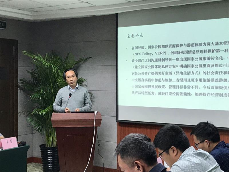 2017年11月28日,由北京師范大學和世界自然基金會(瑞士)北京代表處聯合主辦的“國家公園項目成果交流和國家公園試點進程分享會”在京師大廈舉行,北京大學城環學院旅游研究與規劃中心主任吳必虎教授受邀出席了此次會議,并發表題為《中國國家公園:由旅游向游憩轉型我們準備好了嗎?》的演講。