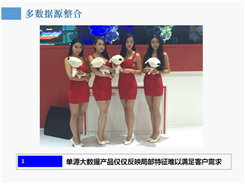我們的政府也一樣,都不愿意把自己部門的數據公開出來,商業公司更不愿意把自己的數據公開。數據能不能共享,我不知道,但是我知道旅游局要做整合, 比如旅游局跟驢媽媽、攜程簽了門票代理,一個月后,旅游局又要跟十幾個OTA簽協議,旅游局市場部的負責人忙的不得了,天天負責談判。實際上這個完全可以通過一個大品牌來完成,所以我說單數據源的產品非常多,但是只能反應局部的情況,很難滿足各種需求。這張圖,美女很美,那游戲實際上不僅僅需要美女,它還是一種精神消費??蛻粜枰裁茨?,需求是多方面的,所以我們說,構筑第三方數據平臺,提高大數據產品的可靠性,這個是擺在單數據源生產商面前的一個挑戰。