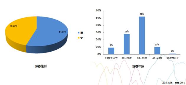 從游客屬性上來看,銅仁市游客中,男性游客占比較高,高出女性游客9個百分點,且游客主要以30-39歲為主,占比52%,其次是20-29歲,占比28%。