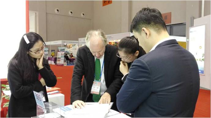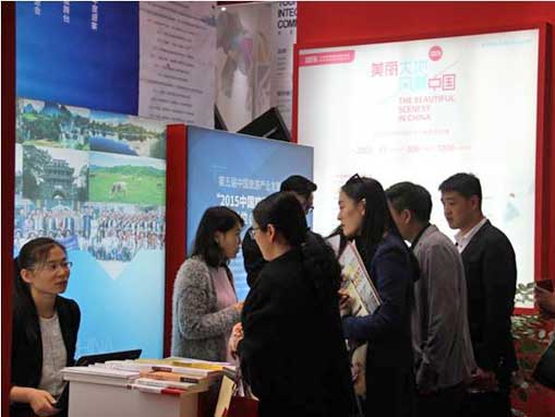 圖:國外參展代表在大地風景的展臺前咨詢