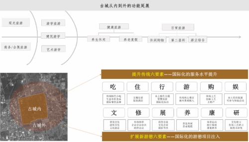 規劃重點任務有兩個,一是對古城外圍舊城更新業態做了引導梳理,遴選策劃了國際品質商業、藝術、休閑等業態,解決古城內空間狹小休閑業態不足的問題。實現城內做觀光、古城外做商業,古城內業態傳統、古城外建筑有機延續、外圍屬于古城的有機生長部分,最終新古共榮。