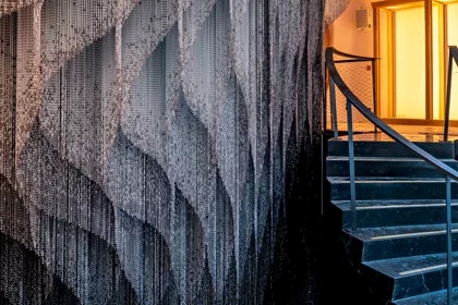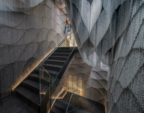 從高迪的“一切取之于自然”的思想出發(fā),此次旋轉(zhuǎn)樓梯裝置的設(shè)計(jì),完美地詮釋了這一原則。新的旋轉(zhuǎn)樓梯取用了來(lái)自西班牙采石場(chǎng)的13噸大理石石料,切割后輔以手工雕刻拋光。從下方仰視,整座樓梯如同盤(pán)旋的龍脊骨,蜿蜒14米高,連接了地下沉浸展廳與原有的住宅層。隈研吾的鏈簾裝置懸浮在整座樓梯之上,如同龍脊背的鱗片,閃爍著銀灰的金屬色。