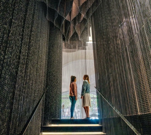 對(duì)于高迪來(lái)說(shuō),光線是建筑的一部分,光線是塑造空間的工具。鏈簾裝置是對(duì)高迪的光線運(yùn)用得完美致敬,游客上下樓梯時(shí),從天光明亮的頂層,到底層幽暗的煤倉(cāng),鏈條閃爍著漸變的藍(lán)色和灰色,給人空間無(wú)限衍生放大的沉浸式體驗(yàn)。