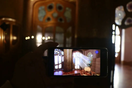 在建筑中游走還會(huì)與驚喜不期而遇。通過(guò)新升級(jí)的智能導(dǎo)覽設(shè)備和運(yùn)動(dòng)感應(yīng)系統(tǒng),當(dāng)游客對(duì)某一處陳設(shè)走近觀看時(shí),屏幕上將自動(dòng)演繹出一段視頻,監(jiān)控的高迪,巴特羅先生和高迪的爭(zhēng)論、巴特羅之家的日常起居等畫(huà)面出現(xiàn)在參觀者眼前。一些隱藏的效果會(huì)在參觀過(guò)程中突然出現(xiàn),比如破墻而出的惡龍、幽然出現(xiàn)的腳印等等。