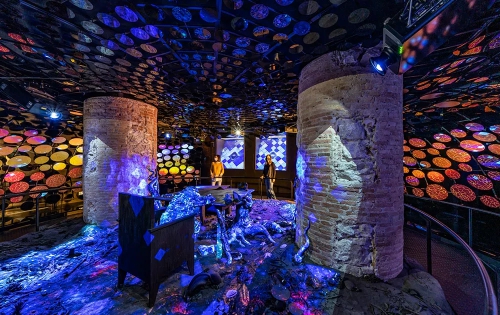 Gaudí Dome 高迪穹頂展廳設(shè)置了1000多面圓形鏡面屏幕,21聲道環(huán)繞立體聲全方位打造出一個(gè)高迪意識(shí)中的自然界,從視覺(jué)、嗅覺(jué)、聽(tīng)覺(jué)、味覺(jué)、觸覺(jué)等多維度營(yíng)造,牽引著參觀者不知不覺(jué)地穿越到過(guò)去與未來(lái),觸摸微觀和宏觀的自然界,主動(dòng)發(fā)現(xiàn)巴特羅建筑設(shè)計(jì)中各種細(xì)節(jié)的靈感來(lái)源。