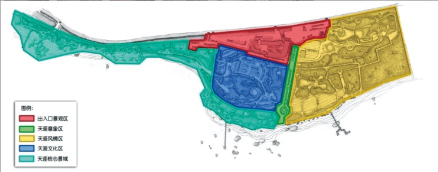 天涯海角景區(qū)位于距三亞市區(qū)約23 公里的天涯鎮(zhèn)馬嶺山腳下,前海后山,風(fēng)景獨(dú)特,是國(guó)家AAAA 級(jí)景區(qū)。“天涯海角”作為中國(guó)陸地最南端的極地景觀和意象的結(jié)合,衍生出豐富的愛(ài)情文化、思鄉(xiāng)文化、流放文化、極限情結(jié)等文化內(nèi)涵,自然景觀與人文情感的互動(dòng)與共鳴,形成了天涯海角的獨(dú)特魅力。但隨著三亞旅游業(yè)的發(fā)展,老牌的天涯海角景區(qū)受到了一定的挑戰(zhàn),景區(qū)發(fā)展出現(xiàn)許多問(wèn)題。目前景區(qū)核心的天涯文化旅游產(chǎn)品僅集中在奇石和摩崖上,產(chǎn)品老化現(xiàn)象嚴(yán)重,新增項(xiàng)目和景觀節(jié)點(diǎn)的文化挖掘不夠,景觀設(shè)計(jì)粗糙而缺乏特色,對(duì)景區(qū)主題造成一定干擾,影響了游客體驗(yàn)。規(guī)劃指出,天涯文化有著豐富的內(nèi)涵,通過(guò)發(fā)展定位、景觀設(shè)計(jì)和項(xiàng)目策劃充分凸顯天涯文化元素,對(duì)游客進(jìn)行“尋情”的心理暗示,是景區(qū)發(fā)展的突破點(diǎn)。為此,規(guī)劃提出了景區(qū)發(fā)展的景觀移情戰(zhàn)略,即圍繞“天涯文化”這一核心,從文化和自然中提取“天涯”元素,通過(guò)典型景觀的梳理和改造,還原和凸顯“天涯”的方位、生態(tài)、歷史、藝術(shù)和情結(jié),通過(guò)景觀所傳達(dá)出的自然元素和文化符號(hào),讓游客在不同的情境中感受和體驗(yàn)“天涯”,使天涯海角游覽區(qū)真正成為人們寄托情感的場(chǎng)所。規(guī)劃根據(jù)景區(qū)資源分布和游客的不同體驗(yàn),將景區(qū)主體分為四大主題功能區(qū):意象天涯區(qū)、寄情天涯區(qū)、感悟天涯區(qū)、棲居天涯區(qū);并對(duì)各大主題區(qū)的產(chǎn)品開(kāi)發(fā)、活動(dòng)策劃和景觀設(shè)計(jì)進(jìn)行詳細(xì)闡述。規(guī)劃還提出在景區(qū)打造“天涯十景”(日月奇石、南天一柱、海判南天、“天涯海角”、天涯文化走廊、天涯情路、天涯部落、天涯書(shū)苑、天涯醉晚亭、花映天涯),作為景區(qū)的重要的觀光節(jié)點(diǎn),起到景觀引領(lǐng)的作用。