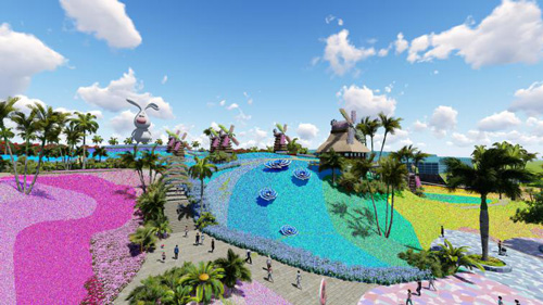 花海入口處一條花拱大道迎接著人們,環顧四周,浩瀚無垠的花海令人嘆為觀止,芝櫻花、喜林草、掃帚草、玫瑰、油菜花、向日葵等不同色彩的植物,打造了一片片夢幻的景觀花海,趣味的植物雕塑、隨風擺動的風車遍布其中。