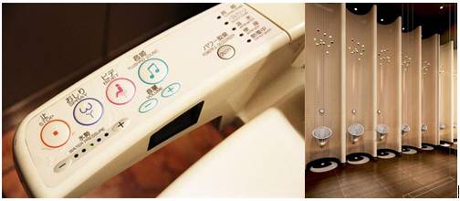 2、個人化的隱私空間。尤其是女廁所,一般都有較廣闊的空間,女性可以在那里休息、化妝,有的還備有化妝水等。而且為了防止排尿的聲音泄露出來使人害羞,還專門設(shè)計了叫做“音姬”混音裝置,這是除日本以外世界任何地方都沒有的裝置。這種裝置開始時使用古典音樂或鳥鳴的聲音掩蓋排尿的聲音,后來覺得這些聲音還是不自然,因此現(xiàn)在通常使用流水的聲音。據(jù)說這種裝置是受江戶時代廁所里具有同樣功能的裝置的啟發(fā)設(shè)計而成的,那時不是水洗廁所,因此此類裝置安裝在便坑里面。