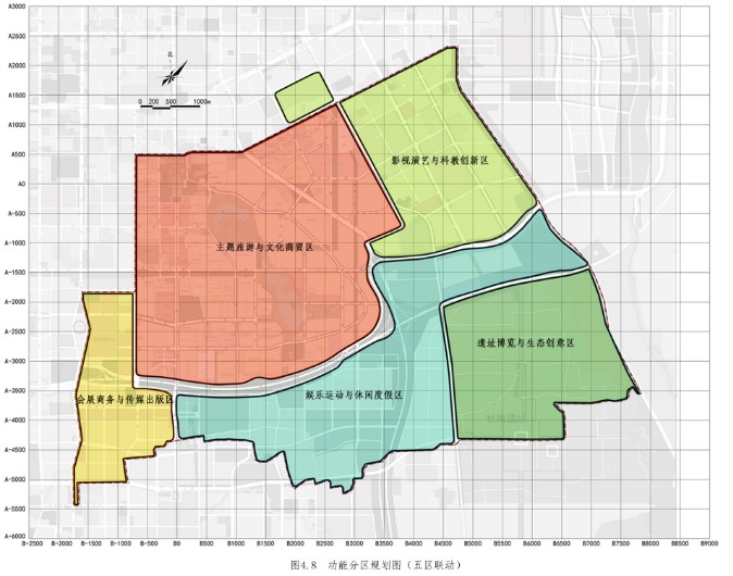 主題旅游與文化商貿區:突出盛唐主題文化,以文化旅游為突出特色的大5A國際景區,運營模式為“遺產文化+主題旅游+綜合地產”。