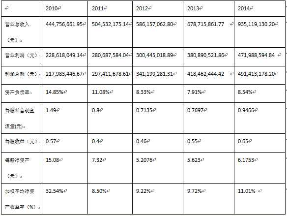 2.宋城演藝的資產(chǎn)負債率低。資產(chǎn)負債率是評價公司負債水平的綜合指標。對比2014年底中央企業(yè)資產(chǎn)負債率達63.3%,可以看出近五年該公司的資產(chǎn)負債率都處在較低的水平。低資產(chǎn)負債率是指一家公司總負債占總資產(chǎn)的比例很少。負債很少可以分為兩種情況:第一、公司本身資金充沛,不需要借錢。第二、公司發(fā)展穩(wěn)健,不準備大幅舉債擴張生產(chǎn)。這兩種情況都能說明公司沒有償債風險,在危機到來時,公司自身抵御風險的能力會更強。
