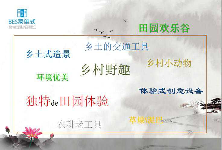 前面主要圍繞“田園歡樂谷”,圍繞鄉土式的造景、鄉村野趣、鄉村動物,這些如何與田園游樂結合所做的思考。實現田園游樂的幾個渠道,農耕工具、鄉村動物、農事活動、種植基礎,如果能夠跟蘇州式的鄉村這樣一個本體元素相結合,我相信能夠挖掘出很多趣味性強、體驗性強、娛樂性強、現代人需要的田園游樂產品。