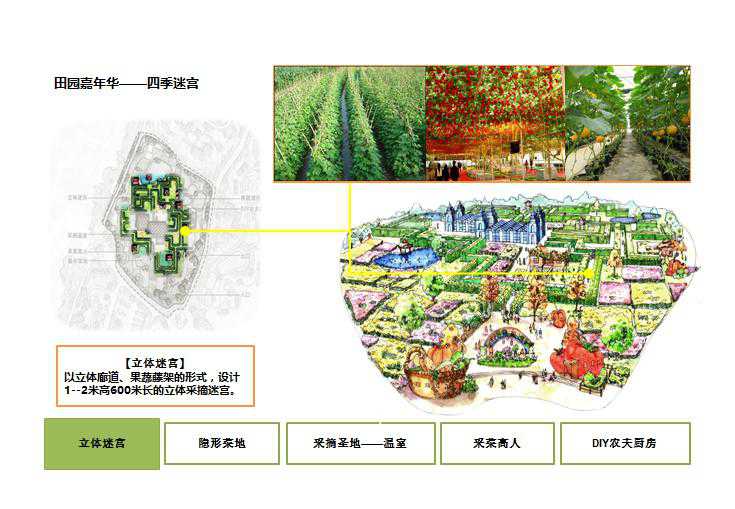 在設計這個種植迷宮的時候也提出來幾種方式,一個是通過立體種植迷宮,與很多線上、線下游戲的玩法相結合。它在整個種植環境當中是一種歷險,甚至是結合主題故事的發展,結合這樣的主題故事做穿越迷宮的探險活動。同時作為一個采摘圣地,實際上它是一個室內的溫室,把采摘的過程包裝成趣味性、體驗性的產品,在這里給游客設定任務,比如在里面找到幾塊隱性菜地,隱性菜地種植季節性作物,五月份適合采摘茄子,六月份適合采摘花生,七月份適合采摘紅薯等等。這些元素有效組合起來,讓游客以一種探險、尋奇的方式穿越在種植環境當中,這就是把田園的環境和游樂的精神相結合,而且讓游客有參與的效果。室內種植和室外種植相結合,把室內種植和現代的科技種植結合,包括植物綠墻、智能溫室,這些效果通過有效的線路組織變成游客全新的采摘方式,甚至采摘之后可以有一個DIY的廚房能夠現場加工,甚至有一些農夫廚房可供游客在里面做一些深加工等等。這充分說明了從簡單的采摘活動就可以衍生出很多不同的玩法,而不是簡單的給你一個籃子進去摘完之后出去秤一秤。