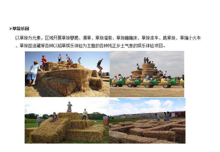 以上主要是針對鄉村的元素、環境、設備跟游樂體驗的結合,我們還在嘗試做一些“瘋狂農樂”系列產品的研發,結合鄉土環境把鄉村的作物、舊物重新包裝,融入現代的游樂理念,把它打造成參與感很強的鄉村田園游樂產品,將這種田園變成瘋狂的鄉村樂園。這是剛剛講的田園歡樂谷中,針對瘋狂農樂系列的思考。