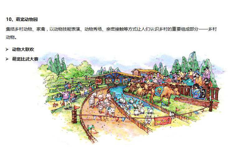 6、鄉村動物。鄉村動物是非常受游客歡迎和喜愛的。曾經設計過萌寵動物園,萌寵動物園的概念是什么呢?匯集了傳統的鄉村動物、家禽,以動物技能的表演和動物秀場的形式及親密接觸,游客通過這些方式認知鄉村動物。設計的鄉村生活體驗園有擠牛奶的項目,大家每天都要喝牛奶,但很多孩子不知道牛奶是怎么出來的。可以設計諸如此類的產品,比如擠牛奶、揀雞蛋、剪羊毛,甚至是擠了牛奶之后可以現場提供殺菌、消毒的設備,之后可以做酸奶。比如說蘇州這邊很多民俗的活動,有特色的手工藝加工,其實都可以結合鄉村的環境做這種體驗和互動。