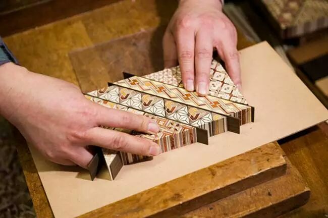 熟手的木工可以把整一個(gè)圖案完整地刨下來,刨出的來就像一張紙一樣,非常柔軟但是帶有木頭的質(zhì)感。以上就是寄木細(xì)工的主要步驟,得到這些有圖案的紙之后可以把它們貼到各種工藝品的表面,然后就形成很漂亮的寄木細(xì)工作品啦!