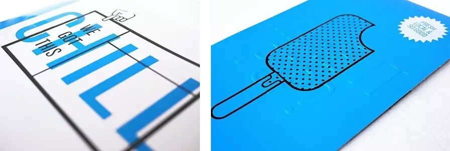 這是洛杉磯帕薩迪納的設計公司FARM推出的一個特別促銷項目。FARM公司在夏天推出了一個嶄新的計劃。他們為了讓客戶保持“冷靜”,特別設計推出了一款冰棍產品。“讓它流行起來,讓它成為明星”是當時設計師們最初的概念。產品包裝采用一個白色的泡沫盒子,這樣的包裝與我們熟悉的蔬菜、海鮮包裝無異,但巧妙的設計師,聰明的使用了藍色封套。并且在封套上印刷了“CHILL”的字樣。并署名“Farm Design Blue”。大膽的現代圖形,先進的印刷技術,五顏六色的包裝,使這一款產品迅速成為“明星”。