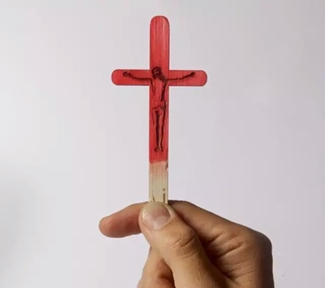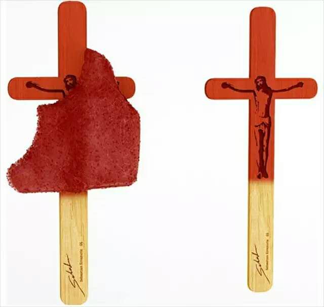 來自藝術家SebastianErrazuriz的創意,耶穌與十字架雪糕(ChristianPopsicles)可能會在這個夏天喚起人們面對食物時的感恩之心:紅色的冰棍(其中據說還加了紅酒),中間是十字架造型的棍子,而棍子上是激光雕刻的耶穌受難像——在顏料的作用下,整個場景濕漉漉血紅一片,有感覺極了。
