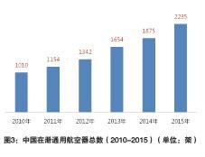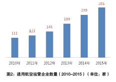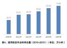 截至20 1 5年底,中國獲得通用航空經(jīng)營許可證的通用航空企業(yè)有281家(見圖2),比2014年增長17.6%;中國通用航空機(jī)隊在冊總數(shù)為2235架(見圖3),比2014年增長13.2%。通用航空飛行作業(yè)時間總量從2010年的36.76萬小時增長至2015年的73.50萬小時(見圖4),5年時間實現(xiàn)翻番,年均復(fù)合增速約15%。