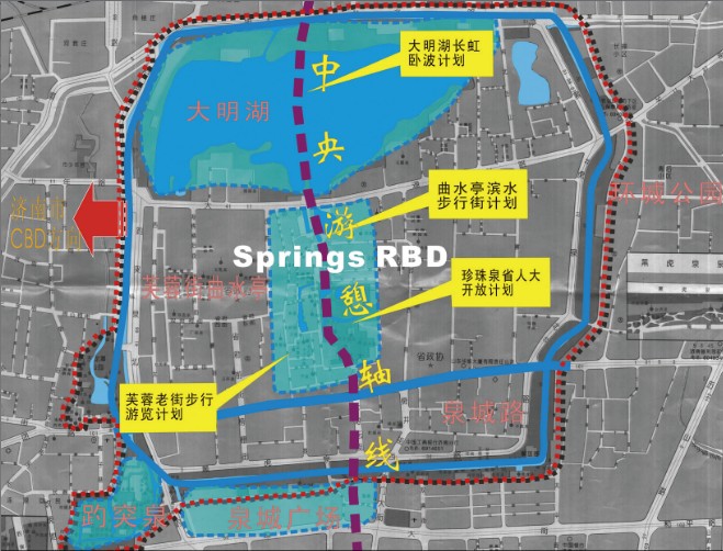 在規劃提出的泉城中央游憩區的理念指引下,從2007 年起,濟南市預計投資84 億元,在老城區全面建設泉城特色標志區,打造三大特色片區:一是以黑虎泉、趵突泉、五龍潭、大明湖、泉城廣場和珍珠泉泉池園林景觀區;二是芙蓉街-曲水亭街地方傳統歷史街區;三是將軍廟街區、泉城路、南門地區商業中心區。