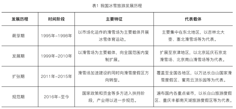 國內(nèi)冰雪旅游于1995年進入萌芽期,1999年進入發(fā)展期,2011年開始進入五年擴張期,2015年冬奧會成功申辦,冰雪運動開始進入加速期,冰雪旅游也開始進入規(guī)范發(fā)展階段,各階段的發(fā)展時間階段、主要特征、代表載體如表1所示。