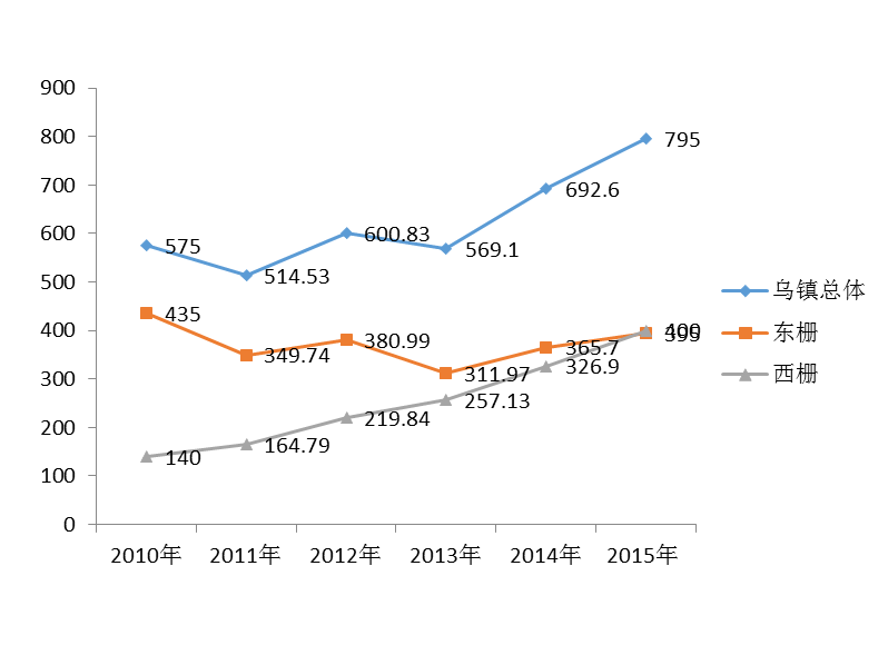 從上圖中可以看出,烏鎮景區持續呈現快速增長趨勢,尤為突出的是西柵景區人數增長明顯,2015年游客量達400萬人次,比2010年增長286%,并且首次超過東柵景區游客量;