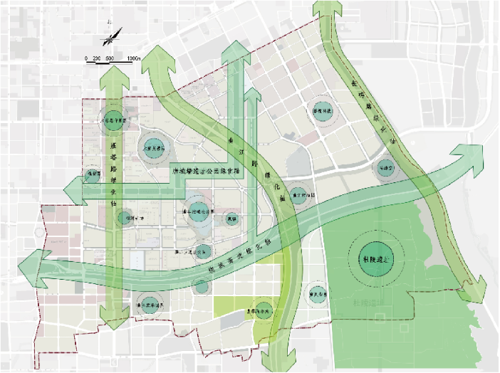 本規劃在分析了西安曲江新區擴區的背景和機遇、必要性與意義的基礎上,提出曲江新區擴區后遵照“雙軸合理、五區聯動”的空間發展布局。“雙軸”即“生態發展軸”和“產業發展軸”,貫穿區域南北東西,形同弓箭,平衡文化與產業發展格局。“五區”指“五大項目集群”,五大區域共同發力,實現“大曲江、大生態、大文化、大產業”的目標。