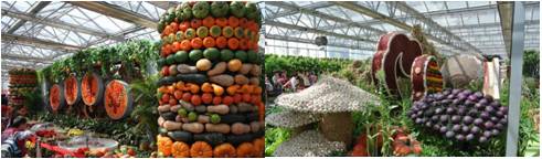 田園創意景觀包括垂直種植景觀、廊架種植景觀,以及農業花果等展現的創意景觀。山東壽光的蔬菜博覽園用瓜果蔬菜營造出極為創意的景觀,科技大棚中的垂直農業景觀等,都是科技景觀的展現。