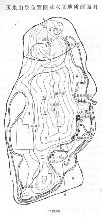 玉泉山泉水來自于隱伏奧陶系灰巖承壓含水層。奧陶系灰巖形成于3~4億年前,該基巖從西山向東,到玉泉山一帶上翹露頭,地下水順著基巖的孔隙以上升泉的形式噴涌而出,形成20多個泉眼,泉眼水流量很大,形成大大小小的泉湖。玉泉是其中最大的一處,乾隆定其為“天下第一泉”。
