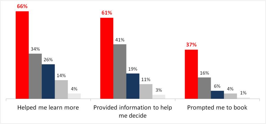 對個人旅行和商務旅行兩類旅游者進行調查(如圖),互聯網對旅游消費決策的影響主要表現在三個方面:幫我獲取更多信息、提供信息幫助我做決策、吸引我預定。