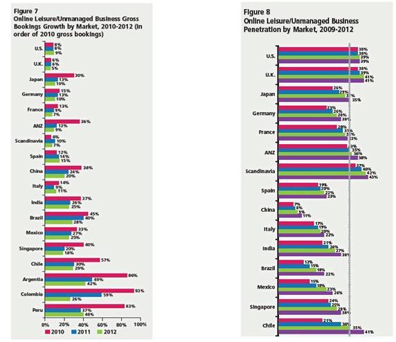 對比分析中國與外國在線旅游滲透率和增長。從下圖可以看出,2010——2012年間,與發達國家相比,中國在線旅游業的滲透率還較低,2012年中國在線旅游滲透率為11%,美國為39%,英國為41%;但增長率較高,2012年中國在線旅游增長率為20%,美國為9%,英國為5%,說明我國在線旅游業發展程度不高,但增長較快,上升空間較大。