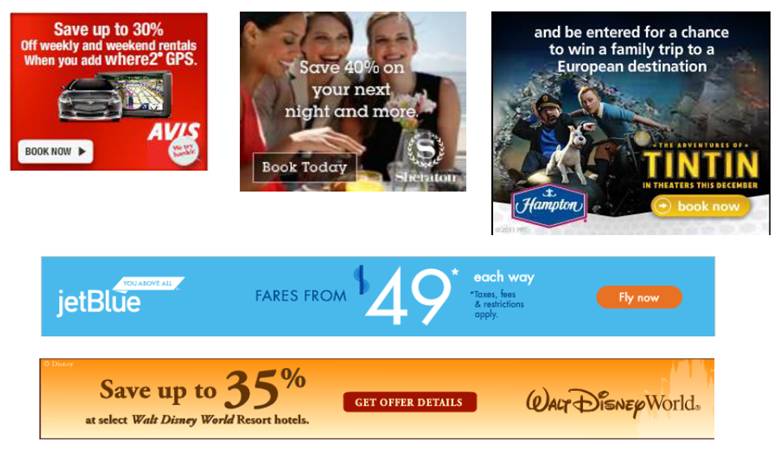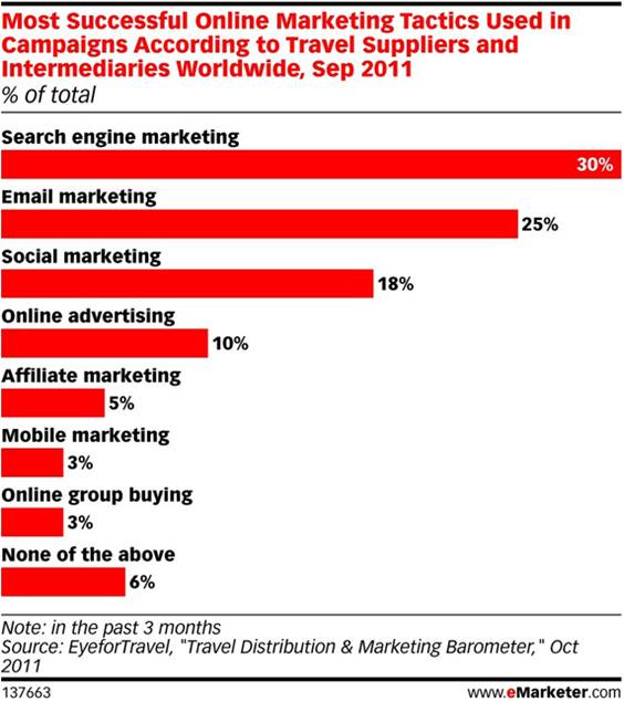 根據2011年購買Google關鍵詞的行業進行分析,旅游行業也已經成為Google的第三大市場,2012年旅游行業已經躍升為第二大類,成為僅次于金融業在Google上投放廣告最多的行業。對2011年7—9月旅游網絡營銷方式進行統計分析,目前旅游在線廣告的主要形式依據比重依次為搜索引擎(30%)、email(25%)、社交媒體(18%)、展示廣告(10%)、代理營銷(5%)、移動互聯網(3%)、在線團購(3%)和其他方式(6%)。