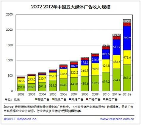 中國現有的五大媒體廣告指電視廣告、報紙廣告、網絡廣告、廣播廣告和雜志廣告,對2002-2012年五大媒體廣告收入規模分析,表明電視廣告增長平穩,市場占有率穩居第一,報紙廣告逐漸下滑,廣播、雜志廣告銳減,而網絡廣告增長迅速,2011年開始市場占有率超過報紙,成為僅次于電視廣告的第二大媒體,并有逐漸逼近的趨勢。