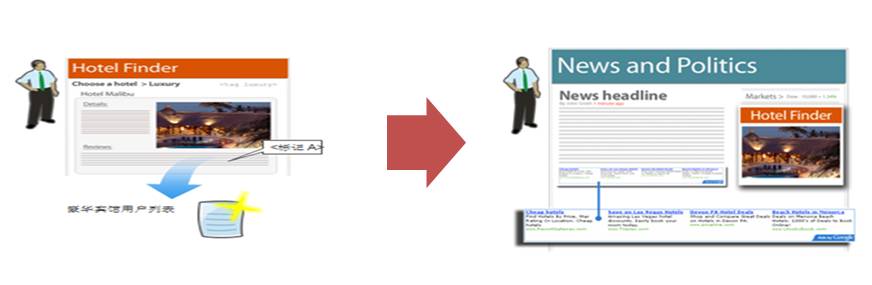 再營銷指消費者打開某一網站后,系統就會自動將用戶的信息記錄在信息鏈條中,而這一門戶網站的廣告就會一直跟著這個消費者。如甲在Google網站上搜索豪華酒店,點擊Hotel Malibu,Google首先將用戶信息保存用戶列表中,其次用戶在瀏覽Google內容聯盟網絡時被認出,多媒體廣告或文字廣告隨后展示。
